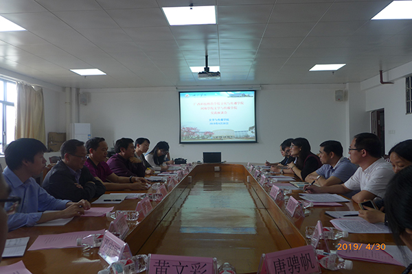 4月30日,广西科技师范学院文化与传播学院党总支书记、院长郑盛锦等一行13人到我院交流,我院院长欧阳珍、党委书记牙运豪、副院长陈代云、刘雨过,党委副书记韦柳以及部分教研室主任参加了交流活动。