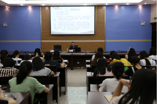张再林还举例讲述了词的格律,例如词有定句,以乐段分片,依词腔押韵,依曲拍断句,这些都是词的体质特点。他强调,在五字句和七字句欣赏与创作上注意与五言、七言词,区分并明确词与诗的文体区别。最后,他以自作《西江月》、《青玉案·悼刘扬忠先生》向同学们表述了词的创作需注意的问题。