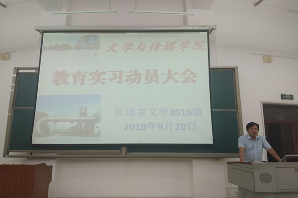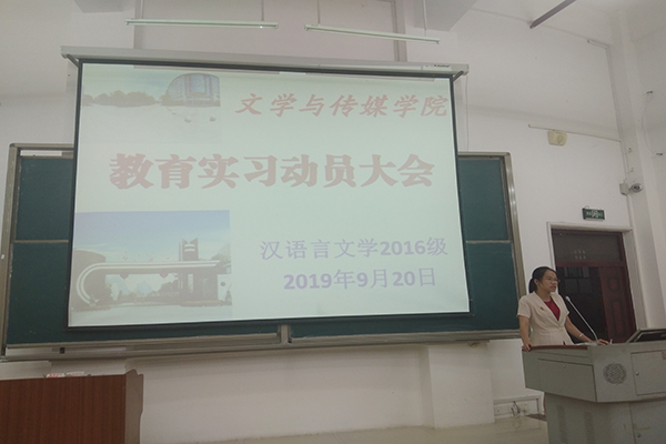9月20日晚,文传学院于西区格致楼负102教室成功召开了2016届汉语言文学专业学生实习动员大会。副院长刘雨过,副书记韦柳,中文系主任欧造杰和中文系副主任黄猛出席了本次大会。2016级汉语言文学专业的全体学生共同参加。