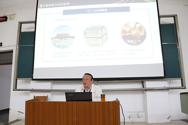 他在谈论中国传统文化背景时特向在座的学生解释“故宫的建筑是中国传统文化的载体”的含义。他指出文化是一个民族内部彼此认同的核心,是超越地位、财富、地区,回答你是谁的问题。谈到民族文化地位时,他列举了一系列中国历史的思想文化先进代表人物。他希望在座的学生能从中爱上中国的经典文化。他提到:“现在最要进校园的是人格教育”,做人要有血性的活着。最后,他指出21世纪是西方文化交流、碰撞、冲突、交流,并借助强大的媒体在前所未有的深度和广度上展开的时代。