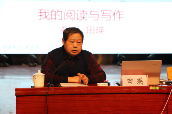 田瑛给师生们带来的讲座题目是《我的阅读与写作》。讲座伊始,他首先盛赞广西“文学桂军”的创作成绩和实力。他说,最近30年来,以东西、凡一平、鬼子、黄佩华、红日等为代表的作家带出一支广西文学队伍,扩大了广西文化影响力,提升了广西文化软实力。他表示,河池学院的校友作家东西、凡一平也因此成为了河池学院的闪亮名片。