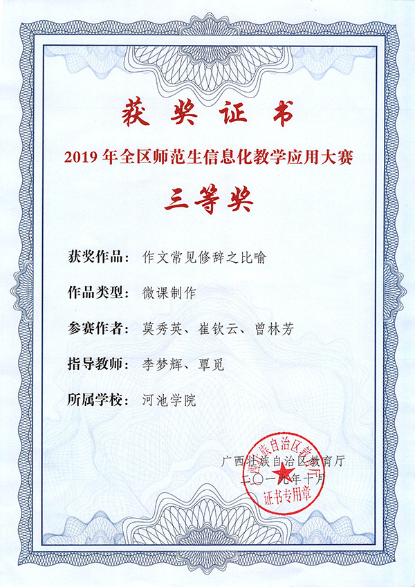 近日,从《自治区教育厅关于公布2019年全区师范生信息化教学应用大赛获奖名单的通知》(桂教师范〔2019〕68号)文件获悉,文传学院2016级汉语言3班莫秀英、崔钦云、曾林芳三位同学合作的微课作品《作文常见修辞之比喻》(指导老师:李梦辉、覃觅)在2019年全区师范生信息化教学应用大赛中荣获三等奖。