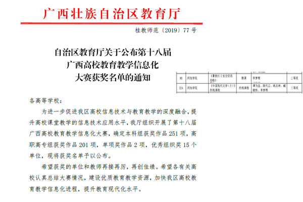 近日,从《自治区教育厅关于公布第十八届广西高校教育教学信息化大赛获奖名单的通知》(桂教师范〔2019〕77号)文件获悉,经过激烈角逐,文传学院李梦辉微课作品《暑假打工安全防范攻略》荣获二等奖,谭为宜、陈代云、姚志林、臧晓彤、李梦辉团队建设的在线课程《中国现代文学史(上)》获得三等奖。