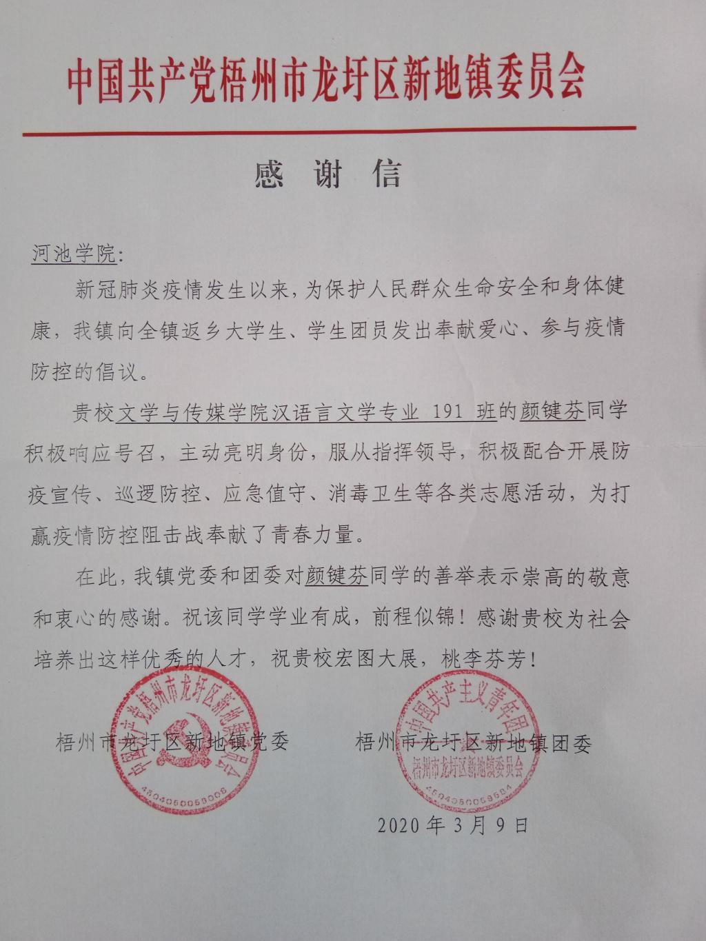 3 月 25 日,河池学院收到一封来自梧州龙圩区新地镇的感谢信,信中对于bw必威西汉姆联汉语言191班的颜键芬同学积极响应号召,投身疫情防控予以充分肯定和感谢,同时感谢学校培养出优秀的人才。