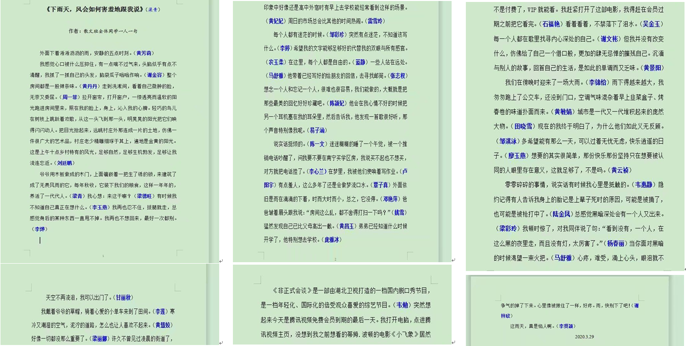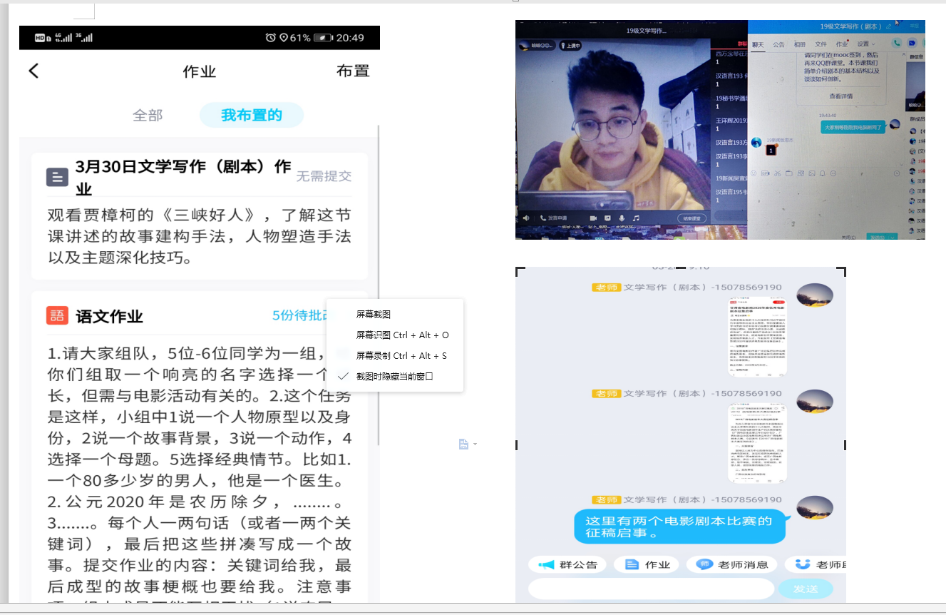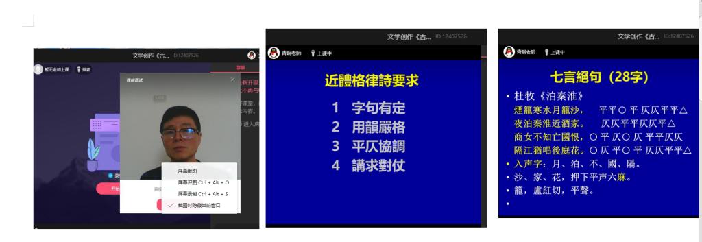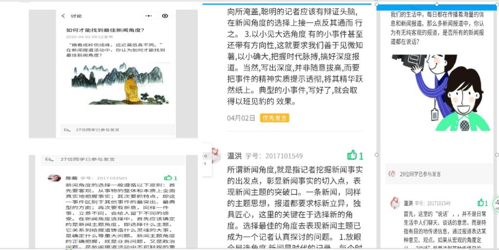 由陆世初老师直播的《散文写作》课积极探索线上写作教学的多种方式,打破传统的散文教学方式,采用线上“一人一句”的即兴写法方式,让学生以接龙方式写作散文。同学们纷纷表示,因为是大家一起创作,所以特别来劲,大家参与创作的积极性明显提高。《下雨天,风会如何害羞地跟我说》成为散文班全体同学集体创作的第一篇散文。此外,陆老师还鼓励学生进行每天一定量的文字线上打卡,以此保持对文字的敏感性。由姚志林老师授课的《剧本写作》也利用线上教学讨论便捷的优势,采用分组讨论,分工合作,集体创作的方式,让学生分成不同小组,每组各负责背景设定、人物设定、情节设置、动作和对白设定等多项任务中的一项,以此激发学生参与剧本创作的兴趣。姚老师还将网上的剧本征文比赛链接汇总发给学生,并鼓励学生积极参赛。寇占民教授直播的《古诗词写作》课,在对“近体格律诗要求”的内容进行在线教学时,以经典为例,极好地引导同学们领悟与模仿。寇老师推出的每张PPT,都经过精心的设计。由银晓明老师主导的《新闻编辑写作》采用线上发起话题讨论等方式,增强了学生的参与感。钟纪新老师的《文秘写作》和欧造杰老师的《文学评论写作》等也有序进行。