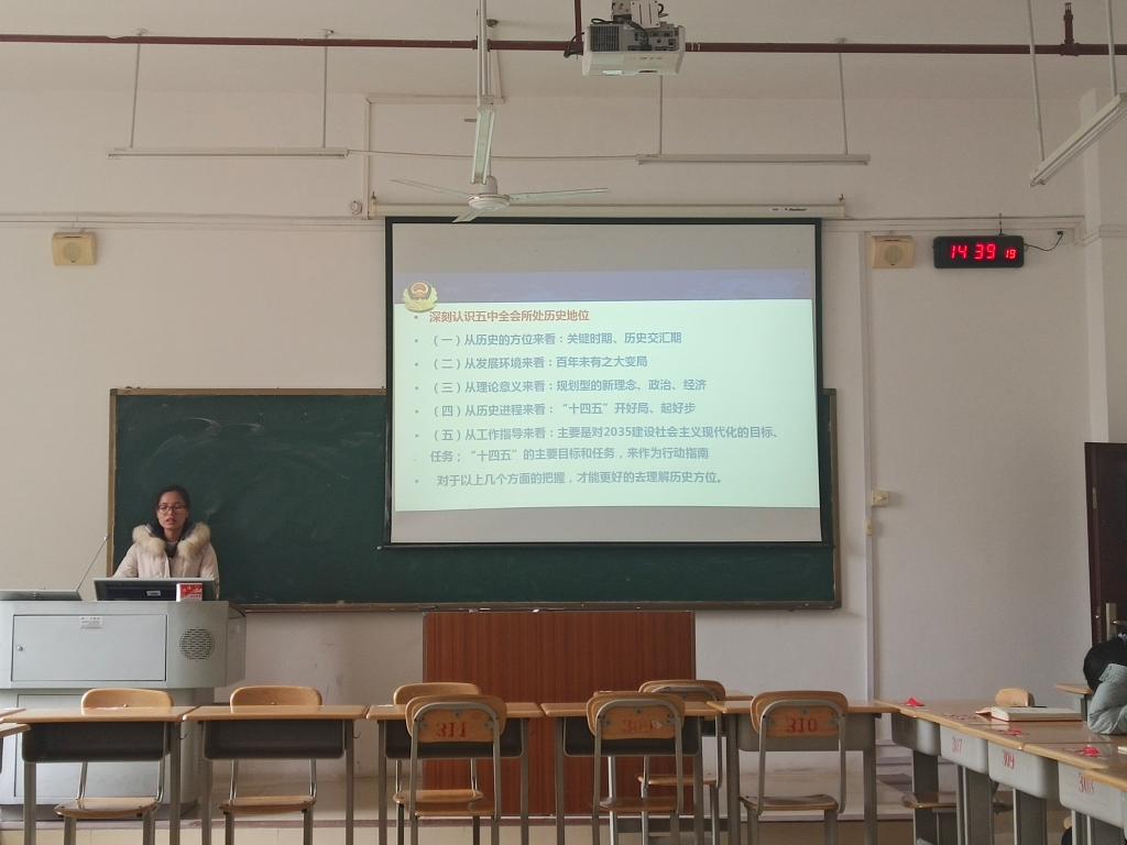 会上,梁珊珊围绕着十九届五中全会会议介绍、十九届五中全会指导思想、“十三五”以来取得的成就、我们面临的机遇与挑战、十九届五中全会总体目标、十九届五中全会工作要求等六个方面深入浅出地进行讲述。李梦辉围绕“八大亮点”“六大硬战”展开讲话,从“十四五”规划、2035年远景目标以及十九届五中全会提出的一系列新的重要思想、重要论断等方面,对党的十九届五中全会精神作了系统宣讲和深入解读。她表示,我们学习十九届五中全会精神,实现“十四五”规划和2035年远景目标,必须深刻认识新发展阶段的内涵和特点,准确把握我国所处重要战略机遇期的机遇和挑战,贯彻新发展理念,构建新发展格局,实现高质量发展。