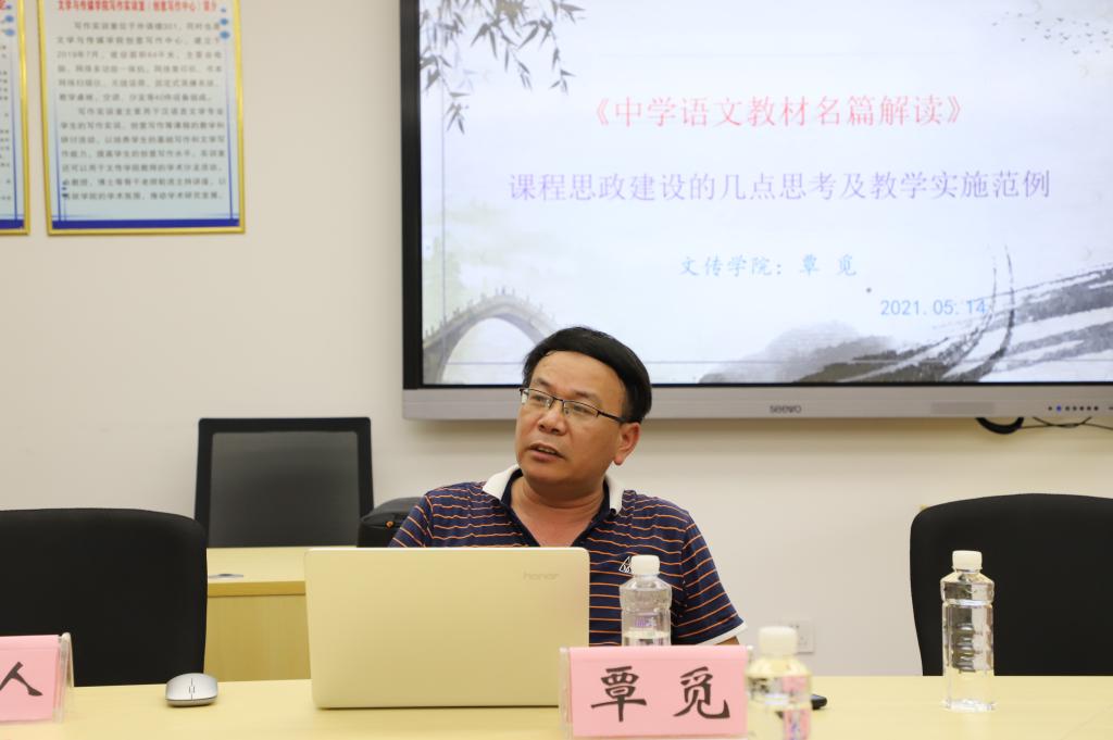 覃觅副教授主要分享了“课程思政”建设的考量、语文核心素养、思政教育的落实以及课程训练实施方法与考核评价标准,介绍了其课程建设的原因、方法与意义。他通过解读莫怀威的《散步》作为语文核心素养与思政教育的实施范例,他表示《散步》一文是家风传承的鲜活教材、真情流淌的生命赞歌,表明语文核心素养和学习语文核心的方式的重要性。生命的赞歌,这是一种新的解读,受到了听众的高度赞美。