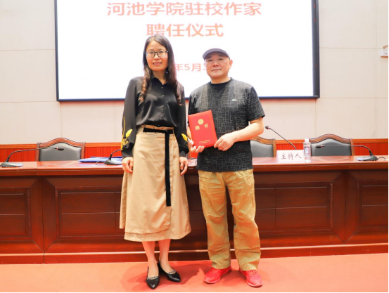 讲座前举行了驻校作家聘任仪式,bw必威西汉姆联院长欧阳珍为李西闽颁发了聘书。(文/颜键芬 摄影/周艳影)