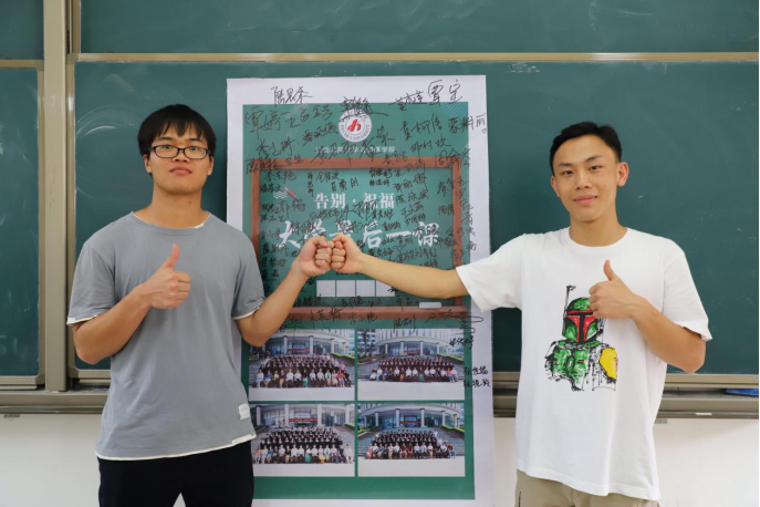 课堂上每一位毕业生桌面上都标有充满仪式感的席位牌。同时,毕业生们纷纷在“告别·祝福·大学最后一课”的海报和主讲教师聘书的背面签名,把名字倾斜在教室的夕阳下,把感动定格在校园的风声里。