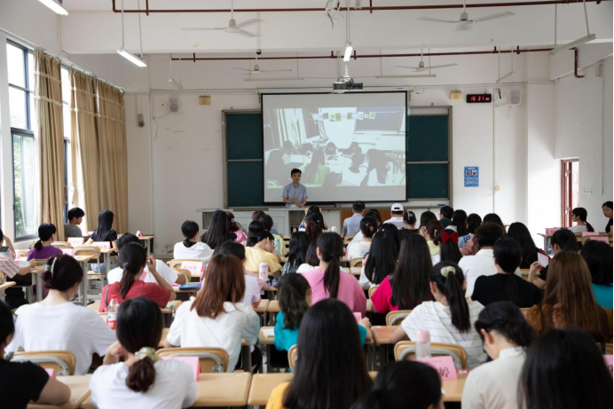 覃永县老师对即将走上讲台的新老师们给予了殷切的期望与深深的祝福。他提醒大家要有教育研究者的自觉,坚持阅读与写作的同时不断地进行实践和反思,最终成为一名优秀的教师。斯藤豪斯曾经说过:“教师即研究者。”教师是一个需要付出研究的职业,而研究就是不断地追问为什么,并给出科学的答案。在今后的教学中,如果碰到问题,我们首先要抱着研究的态度,尽可能详细地描述问题,不断地追问自己“为什么”。接着,要通过阅读来进一步地了解问题并寻求解决之道。“教育中的问题,80%都是老问题。”阅读专业书籍是一个非常高效的解决方式。与黄土路老师所说的文学阅读不同,他强调的是专业阅读,即每个职业都要阅读自己的专业书籍。在找到了解决方法后,我们还需要不断进行实践验证并反思改进。“教育写作,是真正成为名师的唯一途径。”一名教师的专业成长需要通过写作来进行输出。黄锦飞老师努力创作并带动学生创作发表,陶星武老师每天记录下教学生活的点点滴滴,大家要以这两位优秀的教育写作者为榜样。最后,他作为一名老师最朴素的愿望就是希望同学们能在自己身上感受到温暖和爱,并将之传递给自己的学生。