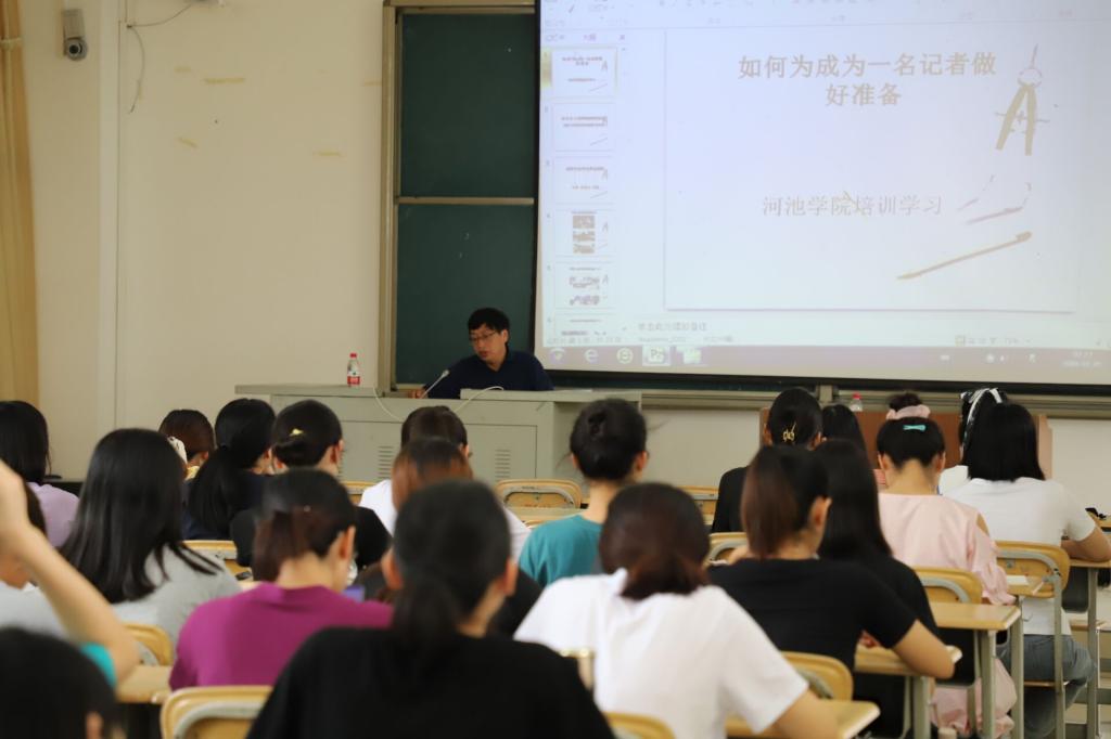 6月25日下午,河池市广播电视台新媒体部主任张龙应邀到我院,为2018、2019级新闻专业90多名学生作专题讲座, 讲座由新闻系主任唐艳林主持。
