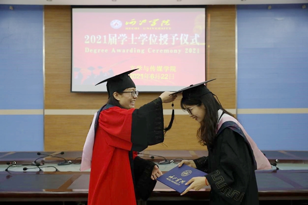 仪式上,欧阳珍为2021届毕业生授学位仪式,并一一为毕业生将帽上的流苏拨正,曾经的大学岁月、温暖的美好祝福、收获的幸福成果都定格在一张张照片中。