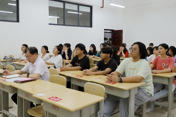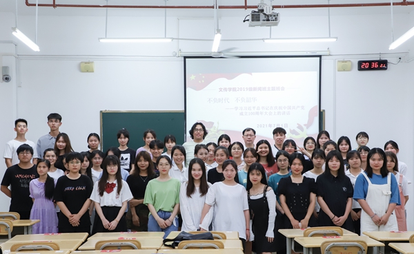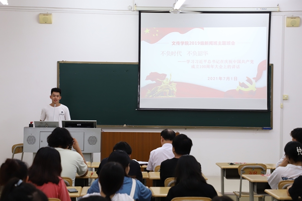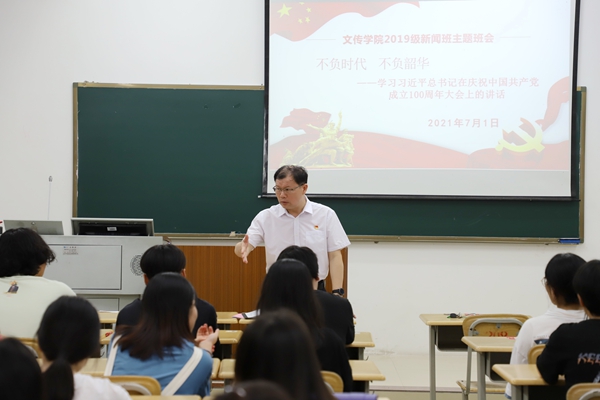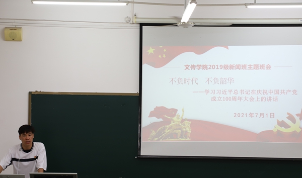 主题班会上,韦文广副校长表示看到同学们在专业上有成长,思想有进步,政治上有追求,政治感觉悟高,他感到十分欣慰,并希望同学们能够继续努力,修业明德,以新闻人的专业眼光紧跟时代发展的步伐。今天是党成立100周年的重大日子,借此机会,他表示,如今我国政治稳定,经济发展,人民幸福安康,同学们见证了党的第一个100年,灾难疫情面前,我国人民能打上疫苗,在座的学生都是受益者,这正是因为党伟大的领导能力,执行能力,亦是国家强大的体现。因此,我们必须坚持中国共产党领导,树立马克思主义新闻观。最后,他对同学们提出三点希望:一政治要强,加强理论学习;二思想要好,要向党学习,学好四史;三品行要高尚,要自强自律。不仅要学新闻也要做新闻,共同进步,不负时代不负韶华。