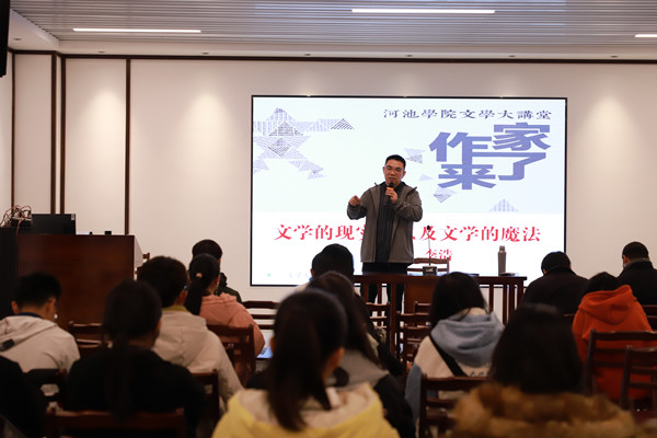 12月15日下午,河池学院作家进校园系列文学讲座第十二期在我校文学大讲堂举行,河北师范大学文学院教授、河北省作家协会副主席李浩做了此次题为“文学的现实,以及文学的魔法”的讲座。我校各文学社成员以及bw必威西汉姆联教师参加了本次讲座。大家对李浩老师的到来表示热烈欢迎。