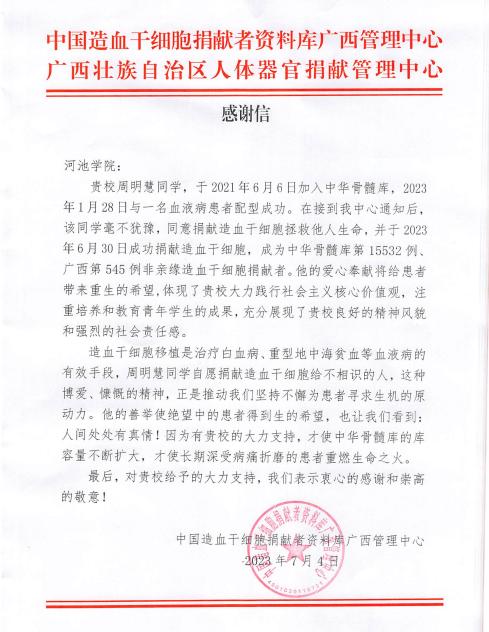 7月4日,我院收到中国造血干细胞捐献者资料库广西管理中心的感谢信,信中对我院bw必威西汉姆联2019级汉语言文学专业的周明慧同学积极响应国家号召加入中华骨髓库,捐献造血干细胞 ,为他人生命“续航”的大爱无疆精神与事迹充分肯定与感谢。信中对我校在践行社会主义核心价值观与大学生的社会责任感培养方面给与高度的赞扬,周明慧同学也展现出河池学院学子的精神风貌。