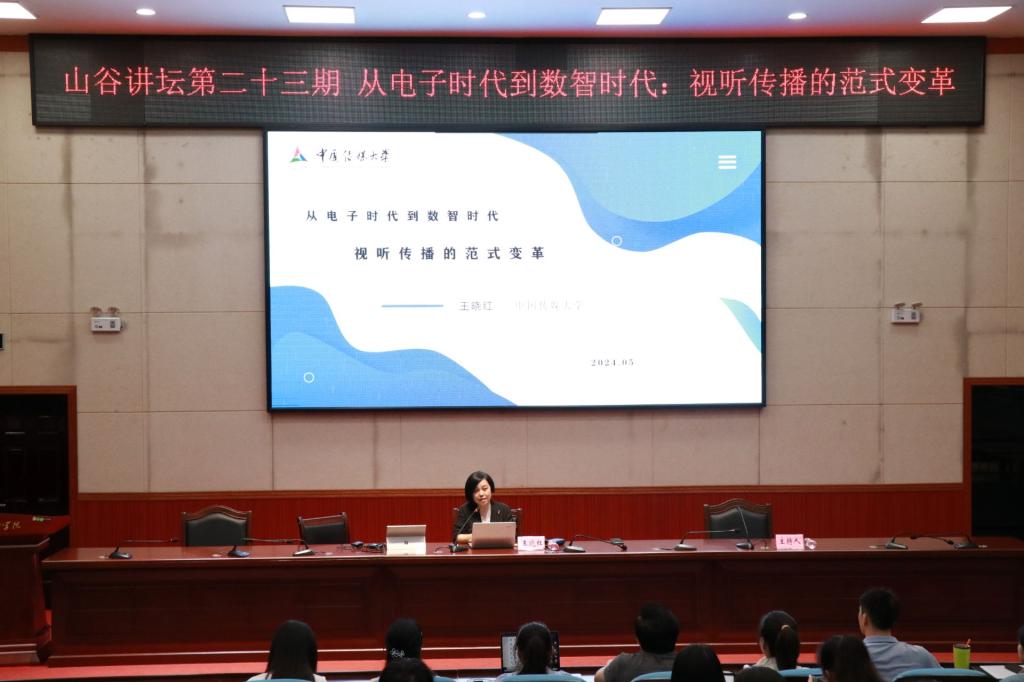 5月31日,山谷讲坛第二十三期在弘毅楼1-205顺利举行。中国传媒大学本科生院院长、博士生导师王晓红教授为我院200余名师生作了题为“从电子时代到数智时代:视听传播的范式变革”的学术讲座。讲座由院长熊建军教授主持。