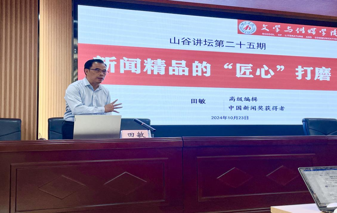 10月23日,山谷讲坛第二十五期在格致楼101顺利举行。河池市融媒体中心副主任(副总编辑)田敏为我院120余师生作了题为“新闻精品的匠心打磨”的学术讲座。讲座由新闻系主任温雅主持。