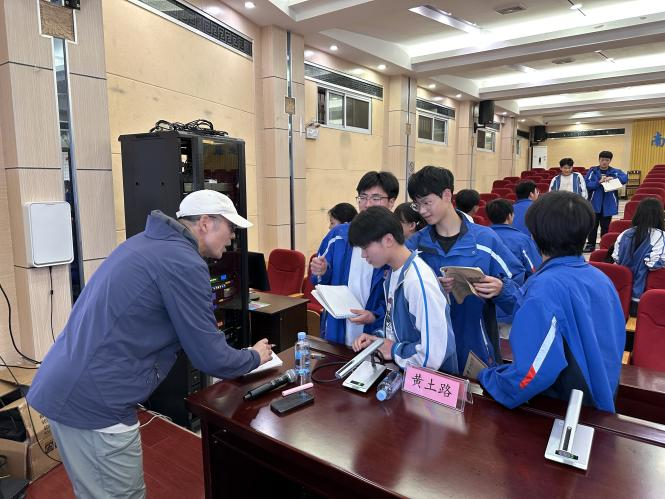 随后,黄土路以 “从简单开始的诗歌写作” 为主题,为高中学生带来一堂充满趣味与深度的诗歌创作课。他以日常事物为切入点,鼓励从平凡生活中捕捉灵感。课堂上,学生们积极响应,纷纷展示即兴创作的诗歌:有的充满想象,有的则是倾诉内心细腻的情感,字里行间流露的真挚感悟引发共鸣。