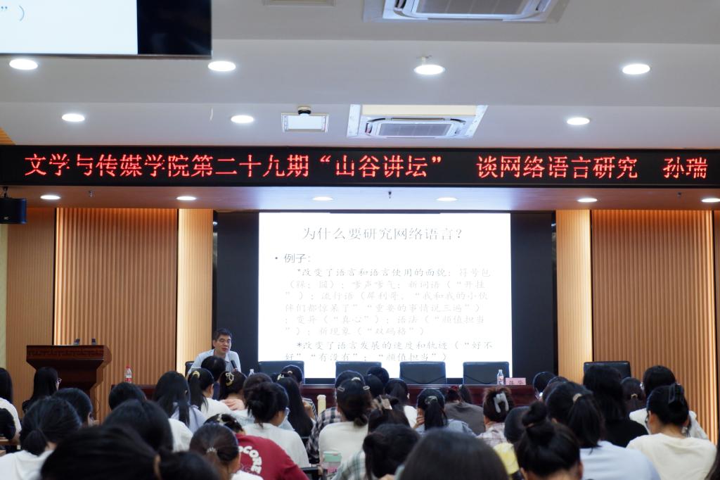 2025年6月20日,第二十九期山谷讲坛在格致楼101报告厅成功举办。应我院邀请,广西大学文学院孙瑞教授带来一场题为“谈网络语言研究”的精彩讲座。讲座由蒋华教授主持,百余名师生到场聆听。