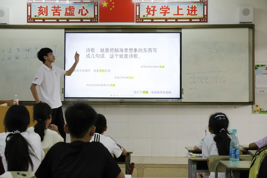 7月14日,在忻城县古蓬镇上浪小学进行朗诵课与诗歌写作课的授课,带领孩子们进行发声、咬字的练习,提高孩子们对朗诵与普通话的认识。引导孩子们联系身边的事物创作儿童诗,带给孩子们不一样的文字体验。