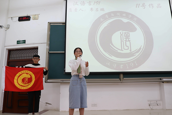 比赛过程,各参赛队伍按照序号依次上台向评委老师及观众解说本班班旗、班徽的结构、颜色、意义和创作历程。其中,7号作品以蓝色作为打底色,寓意着化生学院具有博大的胸怀、永不言弃的精神,图案中间类似糖果的碱基对代表了班级专业以及同学们对美好事物的追求,展开的翅膀代表着19生工全体同学,班旗结构设计集中表现了班级的文化内涵;另外,8号作品也毫不逊色,班徽的整体结构以圆环为主,它寓意着汉语言193班的团结精神,圆环中间的丝带、书本分别代表着希望及知识,并用英文修饰整体结构。此外,各班级设计均以不同的图案诠释班级精神及专业特色,班旗班徽设计风格多样,个性特点突出且解说流利,声音响亮,表现都非常优秀、突出。