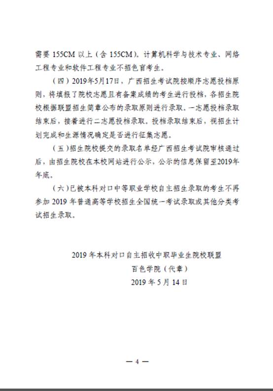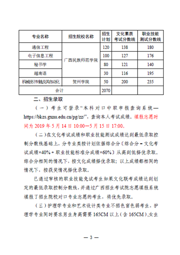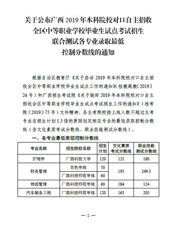 您现在的位置: 首页 > 招生就业 > 招生信息 > 正文 关于公布广西2019年本科院校对口自主招收全区中等职业学校毕业生试点考试招生联合测试各专业录取最低控制分数线的通知 作者: 来源: 时间: 2019-05-19