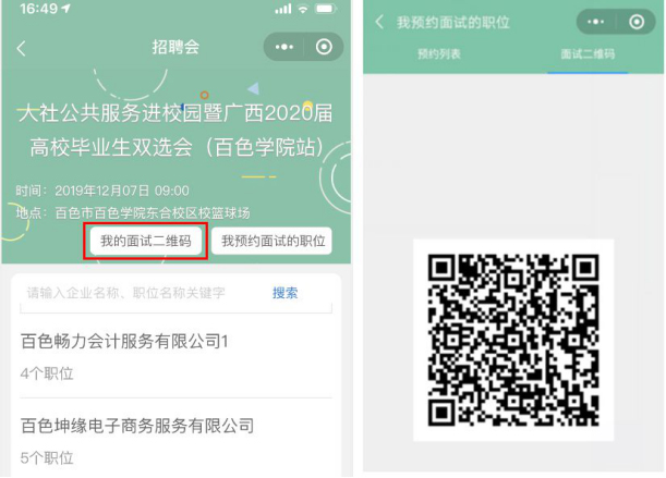 (一)现场面试阶段(2019年12月7日9:00至15:00),点击“我的面试二维码” ,用人单位扫码后可查看已通过的电子简历。