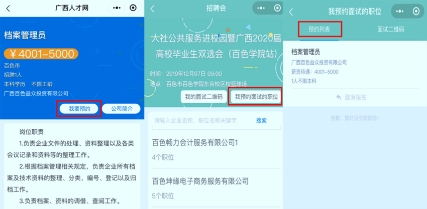 选择心仪企业,点击想要预约的职位,点击“我要预约”,即可预约面试。查看“我预约面试的职位”可以看到已预约面试的职位。(温馨提示:登录广西人才网完善个人简历,使用默认简历可以预约多个职位。)