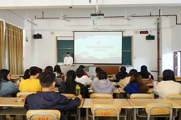 10月30日下午,文传学院学生第一党支部在西区格致楼102教室开展“黄文秀同志先进事迹”专题学习会,党支部书记于晓平主持,支部在校党员及发展对象参加了本次专题学习。