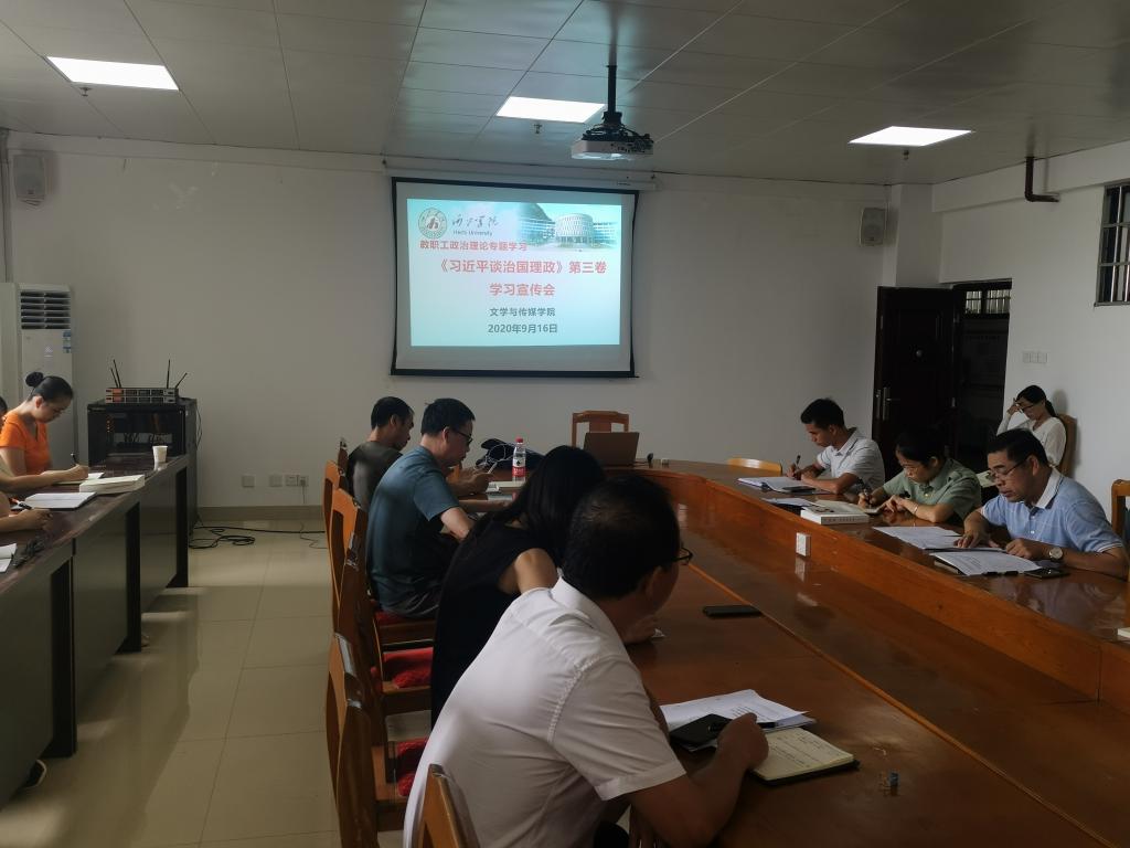 9月16日下午,文传学院在格致楼823会议室召开《习近平谈治国理政》第三卷专题学习宣传会,会议由学院党委书记牙运豪主持,全体教职工参加了本次会议。
