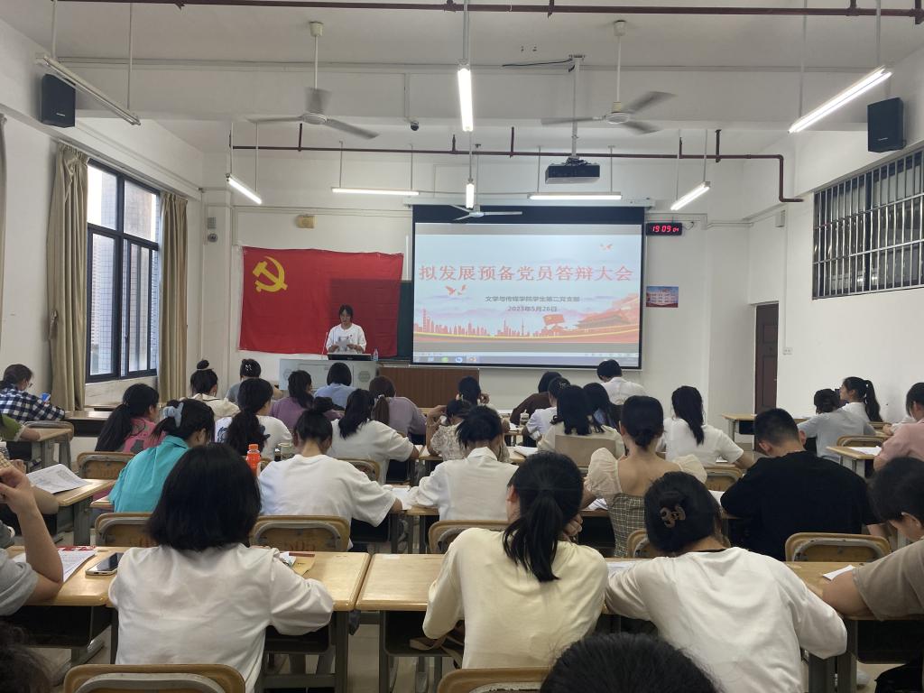 2023年5月26日,文传学院学生第二党支部在格致楼508教室召开了2023年上半年拟发展预备党员答辩会。本次会议由文传学院学生第二党支部书记韦金朋主持,全体在校生党员参加。