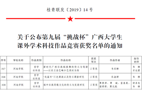 近日,《关于公布第九届“挑战杯”广西大学生课外学术科技作品竞赛获奖名单的通知(桂青联发〔2019〕14号)》文件公布了第九届“挑战杯”广西大学生课外学术科技作品竞赛获奖名单,我院喜获哲学社科类三等奖3项。